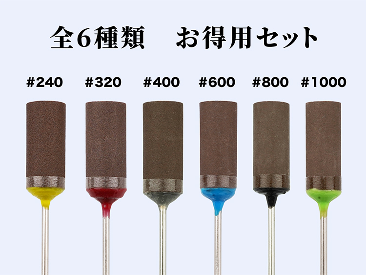 240〜1000番までの6番手をまとめてご用意しました。粗削りから仕上げまで、このセット1つで幅広く対応できます。